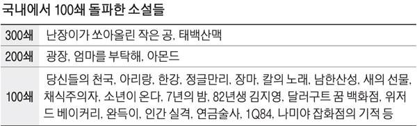 좋은 책을 기억하려는 마음엔 국경이 있을 수 없다. '자아의 신화를 이루어내는 것이야말로 이 세상 모든 사람들에게 부과된 유일한 의무'라고 말한 파울로 코엘료 '연금술사', '이상이 발생한 건 내가 아니라 이 세계다'라는 문장으로 압축되는 무라카미 하루키 '1Q84'도 100쇄 고지를 돌파하며 우리 시대 고전의 지위를 확정 지었다. 히가시노 게이고 '나미야 잡화점의 기적'도 이미 100만부를 넘겨 사랑 받지만 이 풍성한 질주가 언제 멈출지는 아무도 모른다.
