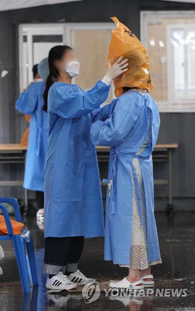 (서울=연합뉴스) 김인철 기자 = 30일 오후 운영이 종료된 서울역광장 코로나19 임시선별검사소에서 의료진이 비를 피하기 위해 비닐봉지를 씌워주고 있다.