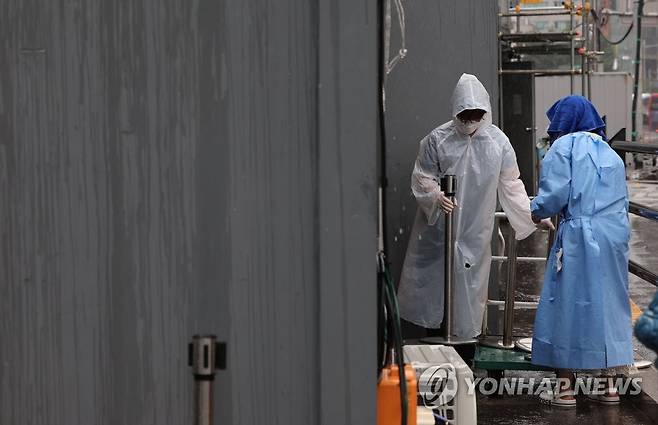 (서울=연합뉴스) 김인철 기자 = 30일 오후 운영이 종료된 서울역광장 코로나19 임시선별검사소에서 중구청 관계자와 의료진이 철거작업을 하고 있다.
