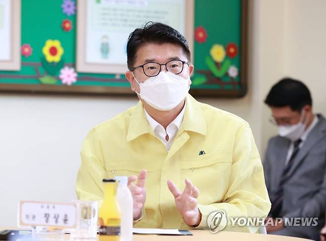 (서울=연합뉴스) 장상윤 교육부 차관이 30일 부산 북구 금곡초등학교에서 교육시설 안전 점검에 대해 학교 관계자들과 논의하고 있다. 2022.6.30 [교육부 제공. 재판매 및 DB 금지]