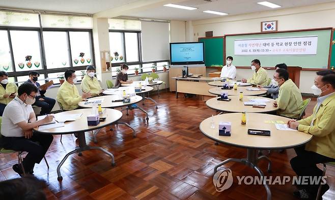 (서울=연합뉴스) 장상윤 교육부 차관이 30일 부산 북구 금곡초등학교에서 교육시설 안전 점검에 대해 학교 관계자들과 논의하고 있다. 2022.6.30 [교육부 제공. 재판매 및 DB 금지]