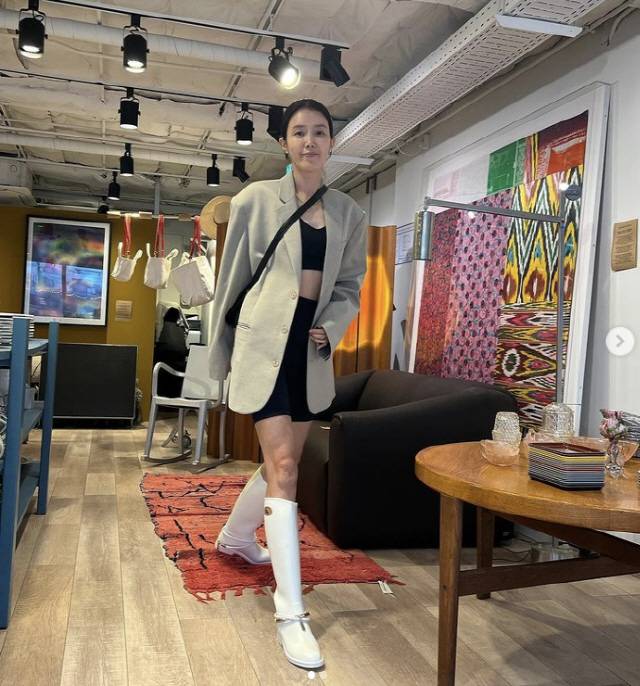 비가 오는 날씨에 무릎까지 올라오는 긴 레인부츠를 신은 채정안은 탱크톱에 팬츠, 자켓으로 힙한 스타일을 완성했다.