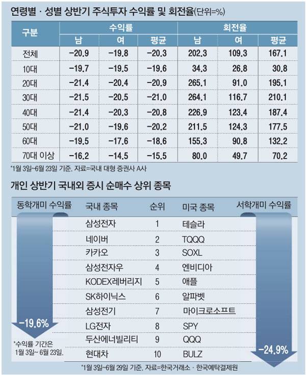 매일경제신문이 30일 국내 한 대형 증권사의 국내외 주식 투자 고객 389만9032명의 올해 상반기(1월 3일~6월 23일) 수익률을 조사·분석한 결과 평균 -20.3%를 기록한 것으로 집계됐다. 이 중 국내 주식 투자자 367만2482명이 -19.6%의 수익률을 기록한 가운데 해외 주식 투자자 79만2298명의 수익률은 -24.9%로 더 부진했다. 해외 주식 투자자의 경우 미국이 98.7%로 대부분이었고 일본 0.4%, 홍콩 0.3% 등이었다.