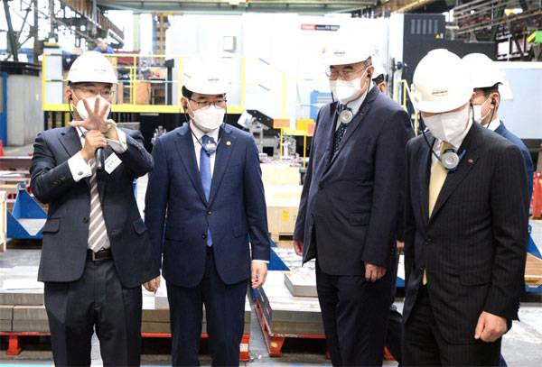 원전 건설 수주 지원을 위해 체코를 방문 중인 이창양 산업통상자원부 장관(왼쪽 둘째)이 29일(현지시간) 체코 서부 플젠 지역에 위치한 두산스코다파워를 방문해 관계자의 설명을 듣고 있다.