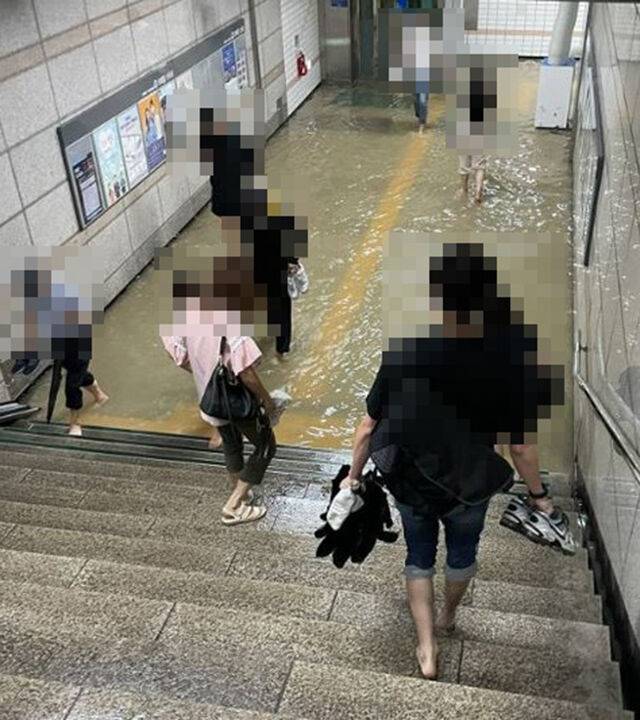 [포착] 폭우에 잠긴 지하철역도 뚫는 K-직장인..극한의 맨발 출근길
