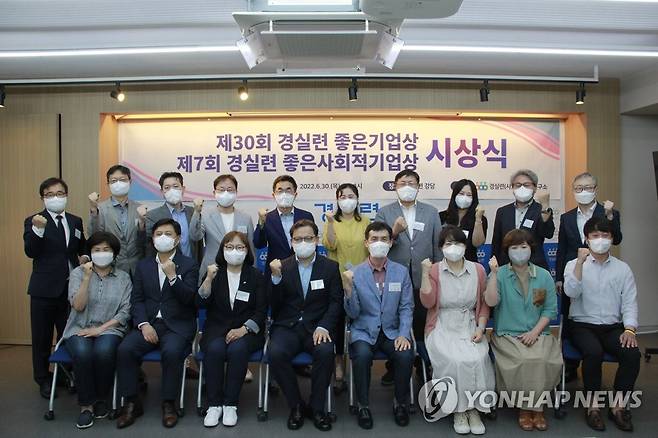 (서울=연합뉴스) 30일 서울 종로구 경실련에서 열린 제30회 좋은기업상 및 제7회 좋은사회적기업상 시상식에서 이의영 경실련 공동대표를 비롯한 시상자 및 수상자들이 기념 촬영하고 있다. 2022.6.30 [경실련 제공. 재판매 및 DB 금지]