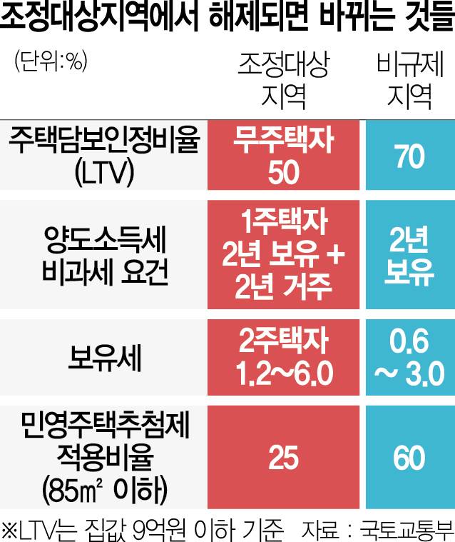 반면 규제가 해제된 지방을 중심으로 시장이 꿈틀댈 수도 있다는 지적도 나온다. 윤지해 부동산 R114 수석연구원은 “수도권이 핵심인데 규제가 해제되지 않았으니 급격한 시장 변동은 없을 것”이라면서도 “규제가 풀린 일부 지방을 중심으로 가수요가 제한적이지만 일부 유입될 수 있다”고 말했다.