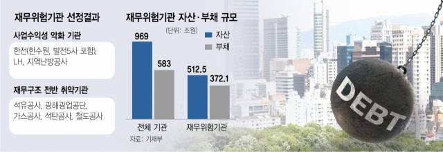 한국전력공사·한국토지주택공사(LH) 등 공공기관 14곳이 재무 위험 기관으로 선정돼 정부의 집중 관리를 받게 됐다. 정부는 이들 기관에 비핵심 자산 매각, 사업 및 인력 구조조정, 지출 효율화 등을 요구하고 반기별로 이행 실적을 점검하게 된다. 문재인 정부 당시 몸집을 키운 부실 공기업에 대한 고강도 개혁이 가능할지 주목된다. 기획재정부는 30일 공공기관운영위원회를 열고 재무 위험 기관 14곳을 선정했다. 정부는 재무 안정성 등을 평가해 점수가 14점 미만(총 22점)이거나 부채비율이 200% 이상인 기관을 재무 위험 기관으로 지정했다. 민간 신용평가사 기준으로 보면 ‘투자 부적격’에 해당하는 기관이다. 재무 위험 기관은 재무구조가 최근 급격히 나빠진 ‘사업수익성 악화(징후)기관’ 9곳과 재무 부실이 누적된 ‘재무구조 전반 취약 기관’ 5곳 등 투트랙으로 다시 나눴다.