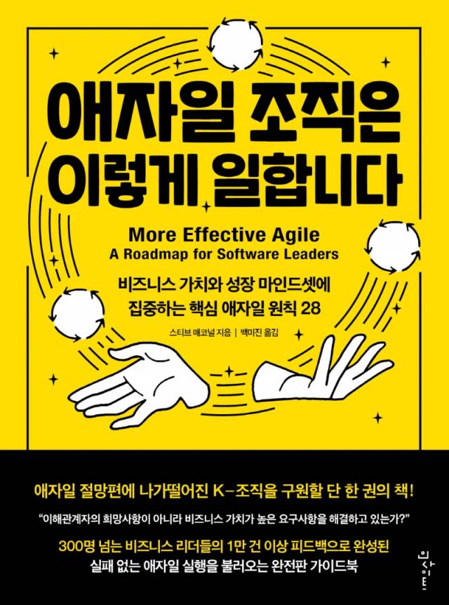 책은 애자일 조직의 리더에게 던지는 질문으로 시작한다. 지금 해결해야 하는 문제가 난해한 것이냐, 복잡한 것이냐? 난해한 문제는 전문가를 통해 답을 얻을 수 있지만 복잡한 문제라면 전문가도 해결책을 선뜻 말하기 어렵다. 저자는 ‘커네빈 프레임워크’로 상황의 복잡성과 불확실성에 따른 유용한 전략을 소개하고, 각 조직에 맞는 애자일 경계를 그리는 방법을 알려준다. 무조건 애자일을 추구하지 않고, 비전과 우선순위에 따라 자율적으로 일하고 성과를 내는 조직의 핵심 애자일 원칙 28가지도 설득력있게 제시한다. 2만원