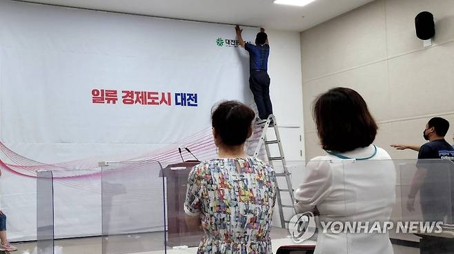 (대전=연합뉴스) 양영석 기자 = 대전시가 30일 민선 8기 시정 구호를 '일류 경제도시 대전'으로 정하고 관련 시설물을 교체하고 있다. 2022.6.30