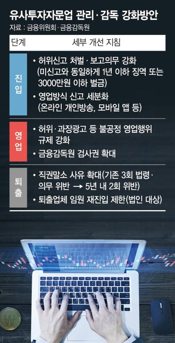 자본시장법 개정이 이뤄져야 가능하다. 금감원 관계자는 "감독 근거가 생겨야 피해예방 효과를 높일 수 있다"며 "규제강화를 통해 위법행위를 골라낸다면 투자자문·중개업을 원하는 업자들로 하여금 요건을 갖춰 제도권으로 이끌 수 있을 것"이라고 말했다.