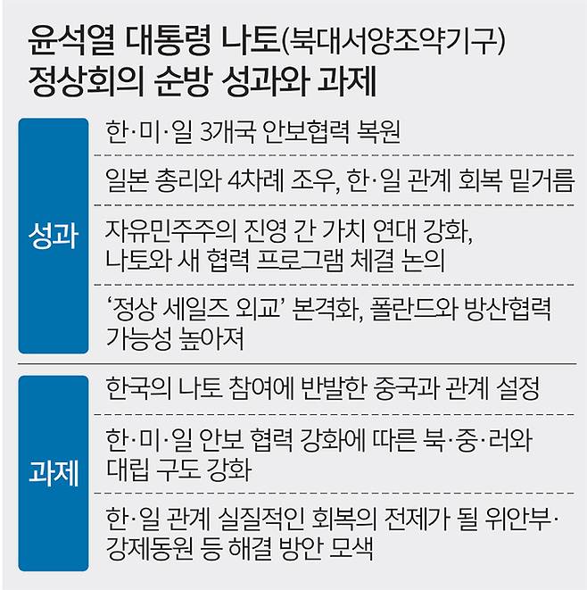 그러나 한국 새 정부의 새로운 외교노선에 불편한 감정을 드러내는 중국과의 관계설정은 한국의 외교적인 도전 과제다. 과거 사드(THAAD·고고도미사일방어체계) 사태와 같은 경제 보복 등이 우려된다는 관측도 나오고 있다. 중국 관영 글로벌타임스는 한·일 정상의 나토 정상회의 참석에 대해 “미국 주도의 나토를 아시아·태평양 지역에 인도하는 것은 경제 및 안보 이익에 도움이 되지 않고, 지역적 대립과 갈등을 악화시킬 것”이라고 밝혔다. 헤이룽장성 사회과학원 다즈강 동북아연구소장은 “한국과 일본은 대중 정책에서 순리를 지켜야 한다”면서 “미국을 따라 중국을 봉쇄하는 것은 안보와 경제적 이익에 명백히 해가 된다”고 강조했다.