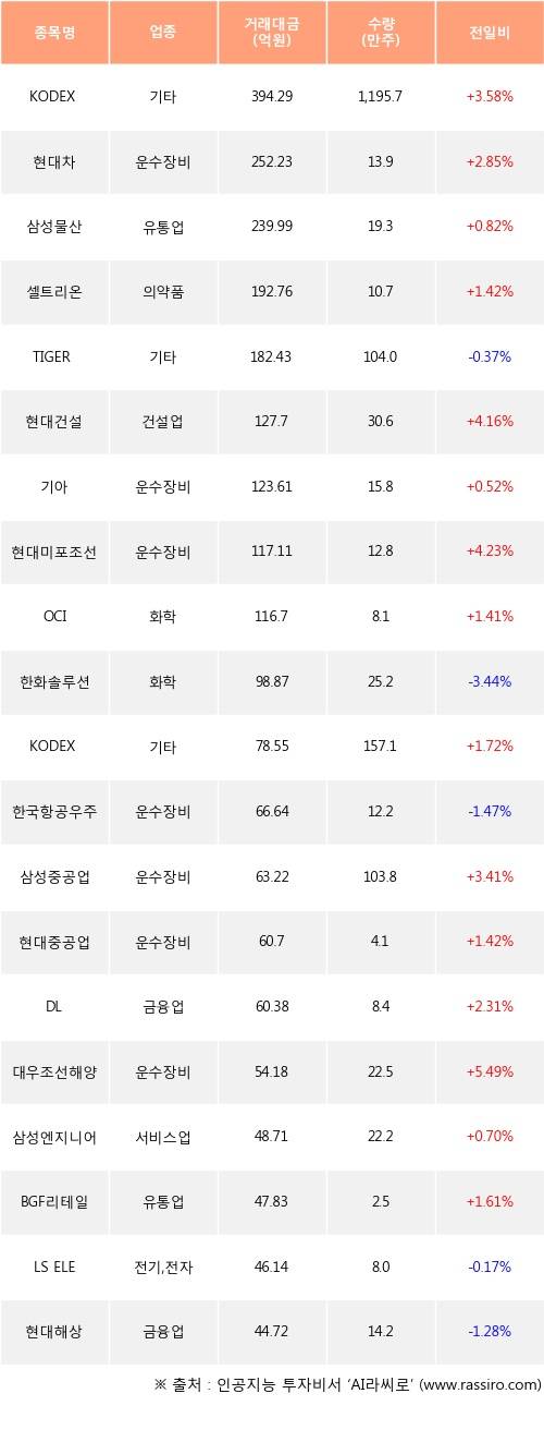 KODEX 200선물인버스2X, 현대차, 삼성물산 등은 전일 대비 주가가 상승했고, TIGER 차이나전기차SOLACTIVE, 한화솔루션, 한국항공우주 등은 주가가 하락했다.
