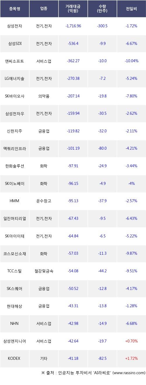 외국인 투자자의 순매도 상위 20개 종목은 삼성전자, 삼성SDI, 엔씨소프트, LG에너지솔루션, SK바이오사이언스, 삼성전자우, 신한지주, 맥쿼리인프라, 한화솔루션, SK이노베이션등이다.