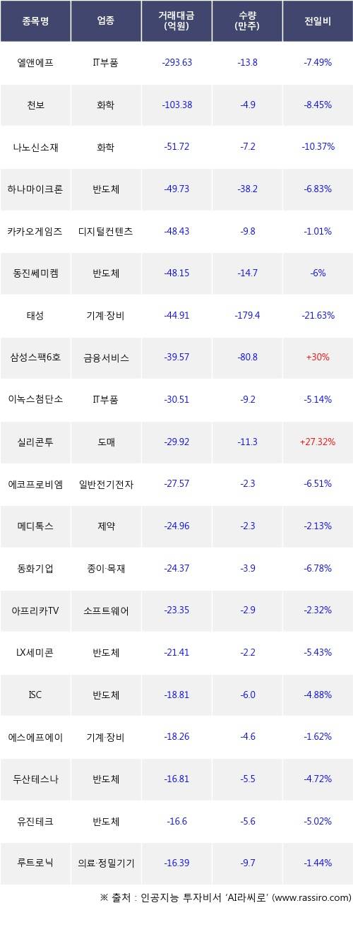 기관 투자자의 순매도 상위 20개 종목은 엘앤에프, 천보, 나노신소재, 하나마이크론, 카카오게임즈, 동진쎄미켐, 태성, 삼성스팩6호, 이녹스첨단소재, 실리콘투등이다.