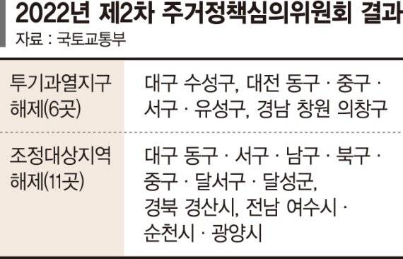 지방권 투기과열지구 중 △대구 수성구 △대전 동구·중구·서구·유성구 △경남 창원 의창구가 해제됐다. 장·단기 주택 가격이 지속적으로 안정세를 보인 조정대상지역 중에서는 △대구 동구·서구·남구·북구·중구·달서구·달성군 △경북 경산시 △전남 여수시·순천시·광양시 등 11곳이 해제됐다.