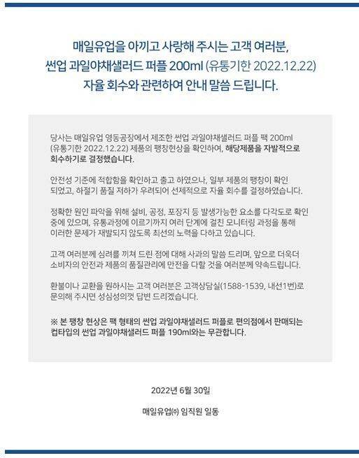 해당 제품은 일부 온라인 거래처를 제외하고는 납품, 판매되지 않았다. 납품된 일부 온라인 거래처는 선제적으로 대응 수거 조치 중이다. 해당제품을 구매한 고객은 매일유업 고객상담실로 연락하면 교환, 환불이 가능하다.