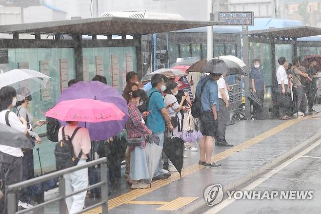 (서울=연합뉴스) 신현우 수습기자 = 폭우로 서울 시내 도로 곳곳이 침수된 30일 오후 서울역 버스정류장에서 시민들이 버스를 기다리고 있다.