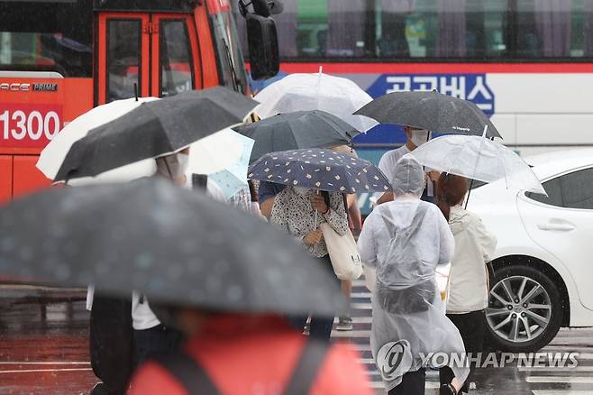 (서울=연합뉴스) 신현우 수습기자 = 폭우로 서울 시내 도로 곳곳이 침수된 30일 오후 서울역 버스정류장 인근에서 시민들이 우산을 쓰고 횡단보도를 건너고 있다. 2022.6.30