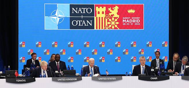 | 동맹국·파트너국 정상회의 보리스 존슨 영국 총리(왼쪽부터), 조 바이든 미국 대통령, 옌스 스톨텐베르그 나토(북대서양조약기구) 사무총장이 29일(현지시간) 스페인 마드리드 이페마(IFEMA) 국제회의장에서 열린 동맹국·파트너국 정상회의에 참석했다. 마드리드=이재문 기자 |