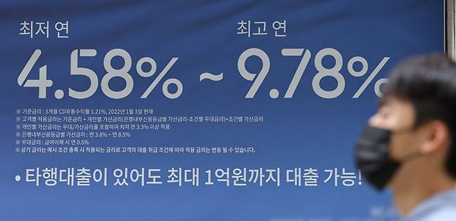 | 대출 받기 무섭네… 최근 서울시내 한 은행 외벽에 대출 안내문이 걸려 있는 곳을 한 시민이 지나고 있다. 한국은행의 30일 ‘금융기관 가중평균 금리’ 발표에 따르면 5월 예금은행의 가계대출 금리는 연 4.14%로 2014년 1월 이후 8년 4개월 만에 최고치를 찍어 서민들의 이자 부담이 전례 없는 수준에 도달했다. 허정호 선임기자 |
