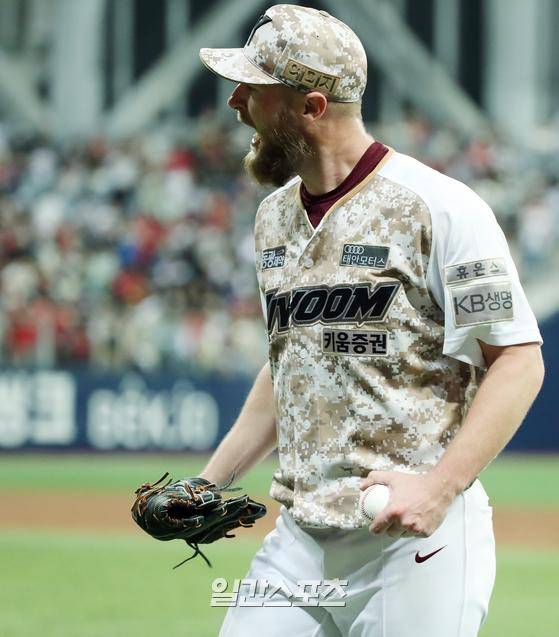 2022 KBO리그 프로야구 키움히어로즈와 KIA타이거즈의 경기가 30일 오후 서울 고척스카이돔에서 열렸다. 2회초 2사 만루 김선빈의 1루 땅볼 때 요키시가 1루 베이스커버를 들어가 타자주자를 아웃시킨 후 포효하고 있다.
