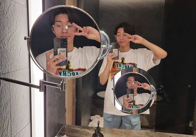 사진 속에는 호텔 화장실에서 거울 셀카를 찍는 임영웅의 모습이 담겨있다. 그래픽 티셔츠에 청바지를 매치해 심플 캐쥬얼룩을 완성한 그는 오버사이즈 안경으로 꾸럭美를 더했다.