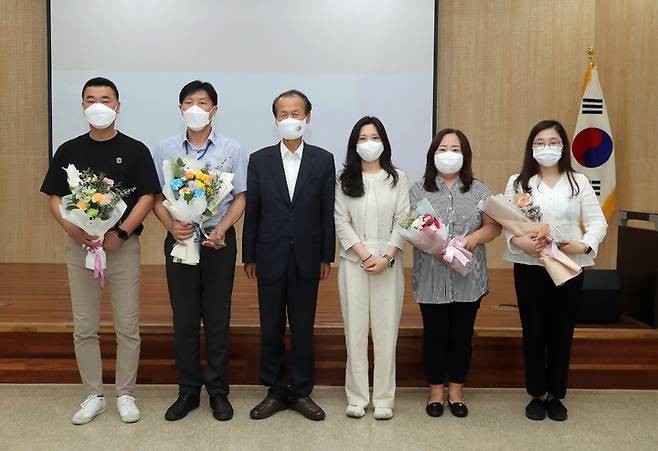 [춘천=뉴시스] 김경목 기자 = 퇴임하는 최문순 강원도지사가 30일 오후 강원 원주시 원주의료원을 찾아 코로나19 의료진들을 격려하고 감사패를 수여 후 기념 사진을 촬영하고 있다. (사진=강원도청 제공) 2022.06.30. photo@newsis.com