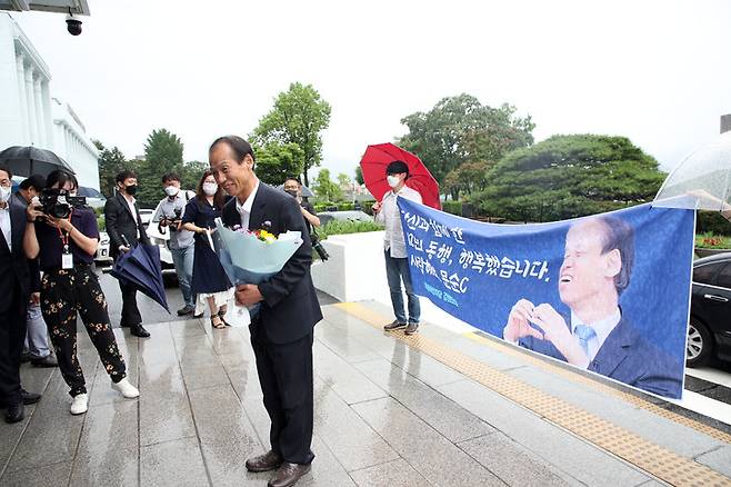 [춘천=뉴시스] 김경목 기자 = 퇴임하는 최문순 강원도지사가 30일 오전 강원 춘천시 강원도청에서 직원들의 환송을 받으며 도청을 떠나고 있다. (사진=강원도청 제공) 2022.06.30. photo@newsis.com
