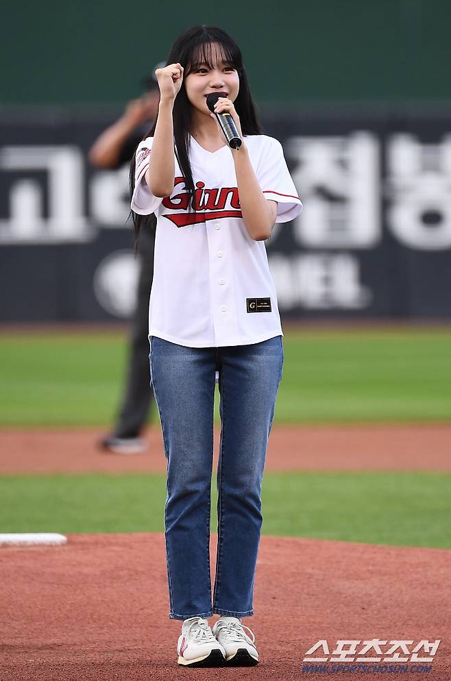 2022 KBO리그 롯데 자이언츠와 두산 베어스의 경기가 30일 부산 사직구장에서 열렸다. 가수 조유리가 시구 전 팬들에게 인사를 건네고 있다. 부산=박재만 기자 pjm@sportschosun.com/2022.06.30/