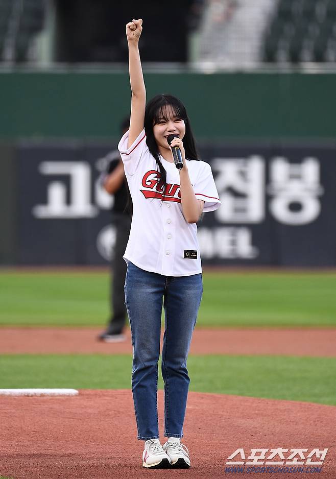 2022 KBO리그 롯데 자이언츠와 두산 베어스의 경기가 30일 부산 사직구장에서 열렸다. 가수 조유리가 시구 전 팬들에게 인사를 건네고 있다. 부산=박재만 기자 pjm@sportschosun.com/2022.06.30/
