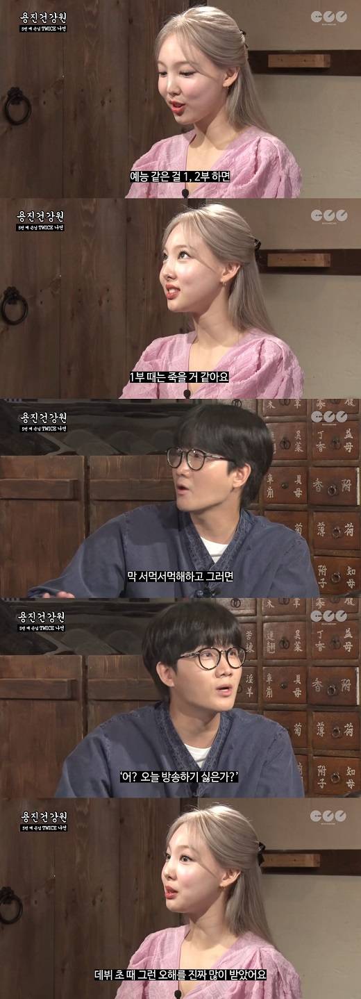 영상에 등장한 나연은 개그맨 이용진이 "낯가림 때문에 왔다고"라고 하자, "예능을 1, 2부 하면 1부 때는 죽을 것 같다. 2부 때는 조금 괜찮다"라고 이야기했다.