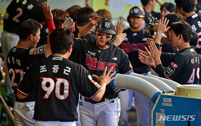 [대구=뉴시스] 이무열 기자 = 30일 오후 대구 수성구 삼성라이온즈파크에서 열린 ‘2022 신한은행 SOL KBO리그’ KT 위즈와 삼성 라이온즈의 경기, 3회초 무사 1루 상황에서 KT 박병호가 투런 홈런을 때린 뒤 덕아웃에 들어서며 동료들과 기뻐하고 있다. 2022.06.30. lmy@newsis.com