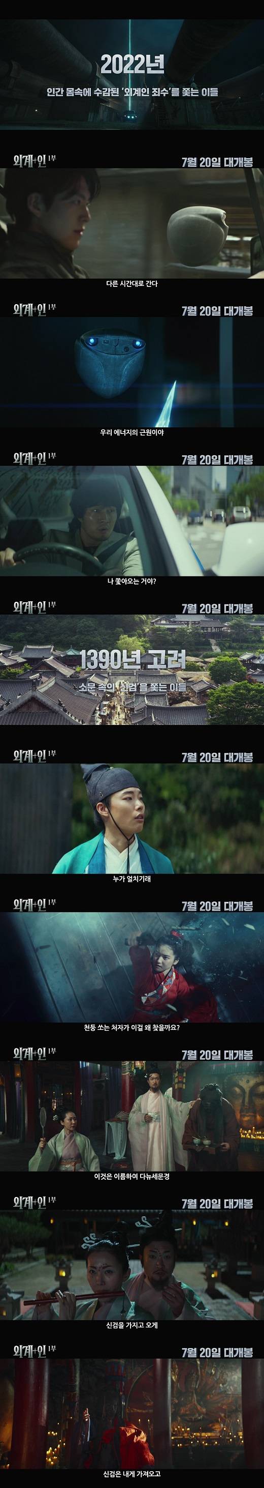 '외계+인' 1부는 고려 말 소문 속의 신검을 차지하려는 도사들과 2022년 인간의 몸 속에 수감된 외계인 죄수를 쫓는 이들 사이에 시간의 문이 열리며 펼쳐지는 이야기를 그린 영화다. 공개된 '캐릭터를 만나다' 영상은 2022년과 1390년 고려, 서로 다른 두 시대를 배경으로 한 다채로운 캐릭터들의 활약을 담아 시선을 집중시킨다. 외계인 죄수를 관리하는 ‘가드’가 자신의 파트너 썬더와 함께 임무를 수행하는 모습은 인간의 몸속에 외계인 죄수를 수감시킨다는 독창적인 설정에 호기심을 자아낸다. 여기에 외계인에 쫓기는 형사 문도석이 서울 도심을 누비며 자신을 뒤따라오는 외계 비행선을 피하는 모습은 팽팽한 긴장을 더하는 동시에 영화의 압도적인 스케일을 실감케 한다. 또한 갖가지 도술을 부리는 얼치기 도사 무륵과 베일에 가려진 천둥 쏘는 처자 이안이 신검을 차지하기 위해 고군분투하는 과정은 신검의 정체와 그를 둘러싼 이야기에 궁금증을 자극한다. 뿐만 아니라 신묘한 도술의 무기를 파는 삼각산의 두 신선 흑설과 청운의 환상적인 호흡이 유쾌한 웃음을 불러일으키는 가운데, 신검을 차지하려는 가면 속의 인물 자장의 남다른 위용은 미스터리함을 배가시키며 이들 앞에 어떠한 전개가 펼쳐질지 기대를 끌어올린다. 이렇듯 각양각색 캐릭터의 매력과 스토리를 고스란히 담은 '캐릭터를 만나다' 영상을 최초 공개한 '외계+인' 1부는 신선한 재미와 짜릿한 전율을 안기며 올여름 극장가를 뒤흔들 것이다.