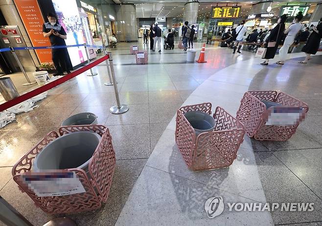 (서울=연합뉴스) 김도훈 기자 = 서울을 비롯한 수도권에 호우 특보가 내려진 30일 오후 서울 용산역에 천장 누수로 인한 물받이 통들이 세워져 있다. 2022.6.30