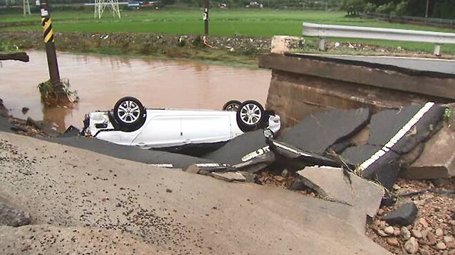 끊어진 다리 아래 뒤집힌 승용차 위로 세찬 물결이 몰아칩니다.