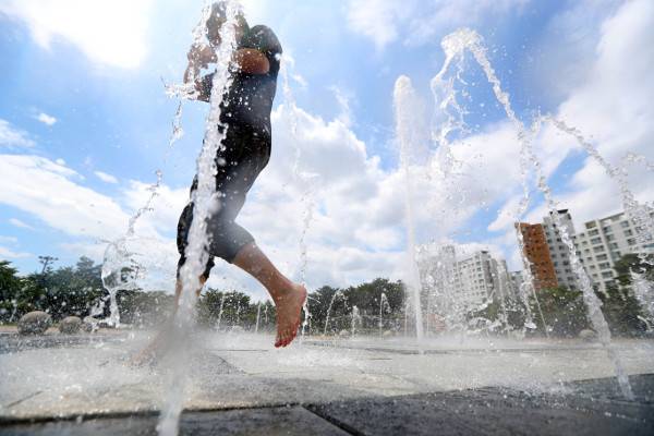 한 시민이 30일 대구 동구 율하체육공원 바닥분수에서 솟구치는 물로 열기를 식히고 있다. 기상청은 이날 오전 11시를 기해 대구 등 경북 일부지역에 폭염경보를 발령했다. 연합뉴스