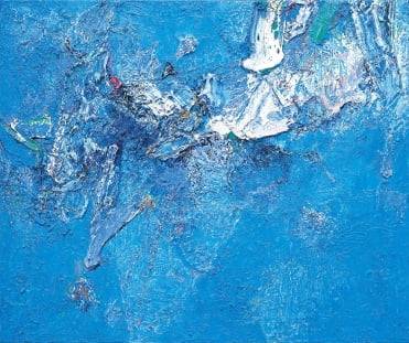 김 작가는 나이프와 붓으로 수십~수백번 색을 칠하고 벗겨내는 과정을 반복해 작품을 완성한다. 이렇게 만들어진 작품은 드넓은 바닷속이나 우주 등을 떠올리게 한다.