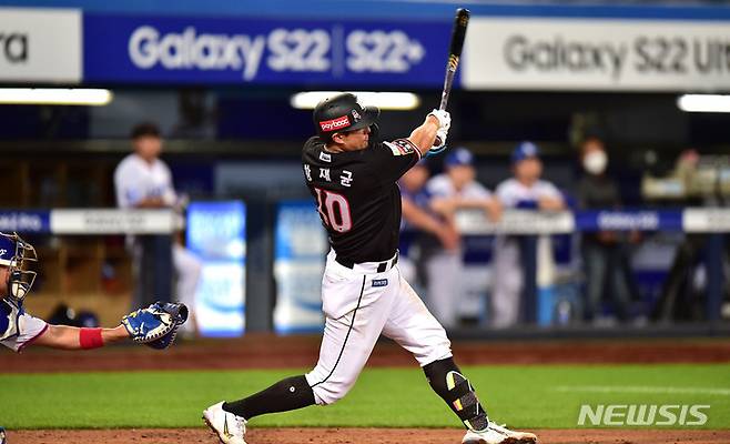 [대구=뉴시스] 이무열 기자 = 30일 오후 대구 수성구 삼성라이온즈파크에서 열린 ‘2022 신한은행 SOL KBO리그’ KT 위즈와 삼성 라이온즈의 경기, 7회초 무사 1,2루 상황에서 KT 황재균이 스리런 홈런을 때리고 있다. 2022.06.30. lmy@newsis.com