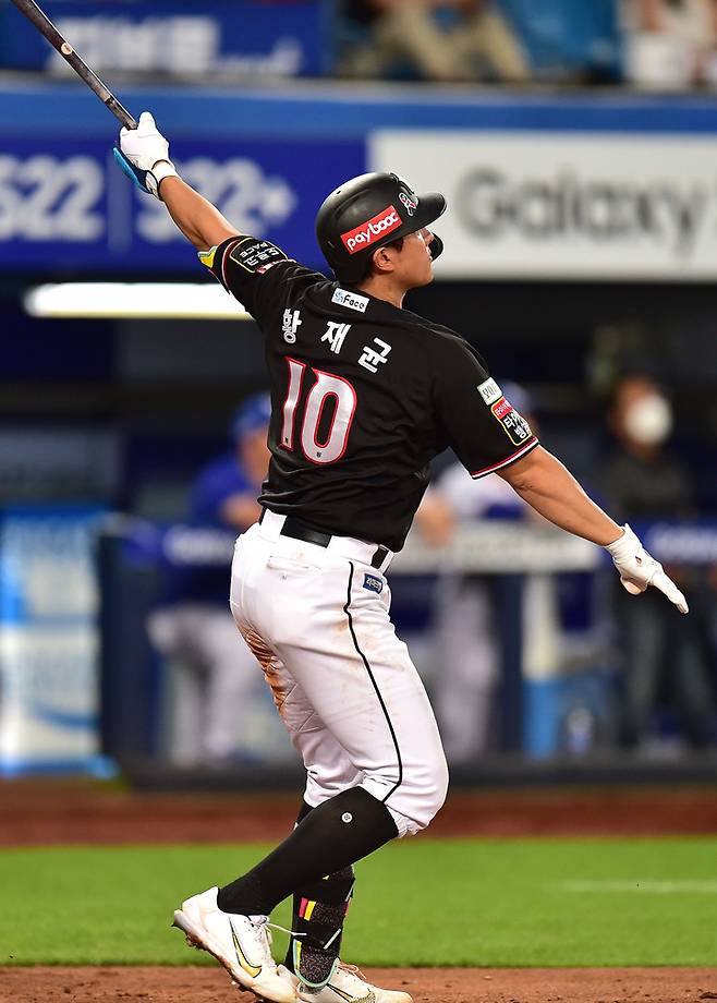 [대구=뉴시스] 이무열 기자 = 30일 오후 대구 수성구 삼성라이온즈파크에서 열린 ‘2022 신한은행 SOL KBO리그’ KT 위즈와 삼성 라이온즈의 경기, 7회초 무사 1,2루 상황에서 KT 황재균이 스리런 홈런을 때리고 있다. 2022.06.30. lmy@newsis.com