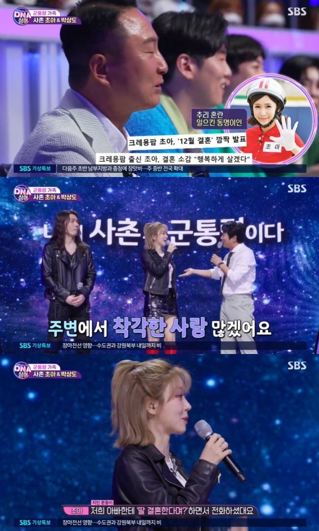 이수근이 “주변에서 착각한 사람 많겠다”라고 무닺, 초아는 “저희 아빠한테도 ‘딸 결혼한다며?’라고 전화가 왔다고 한다”라고 말했다.