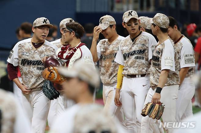 [서울=뉴시스] 조성우 기자 = 29일 오후 서울 구로구 고척스카이돔에서 열린 2022 KBO리그 KIA 타이거즈 대 키움 히어로즈의 경기, 키움이 KIA에 5-4 승리를 거두며 3연전 스윕과 5연승을 기록했다. 키움 선수들이 기쁨을 나누고 있다. 2022.06.30. xconfind@newsis.com