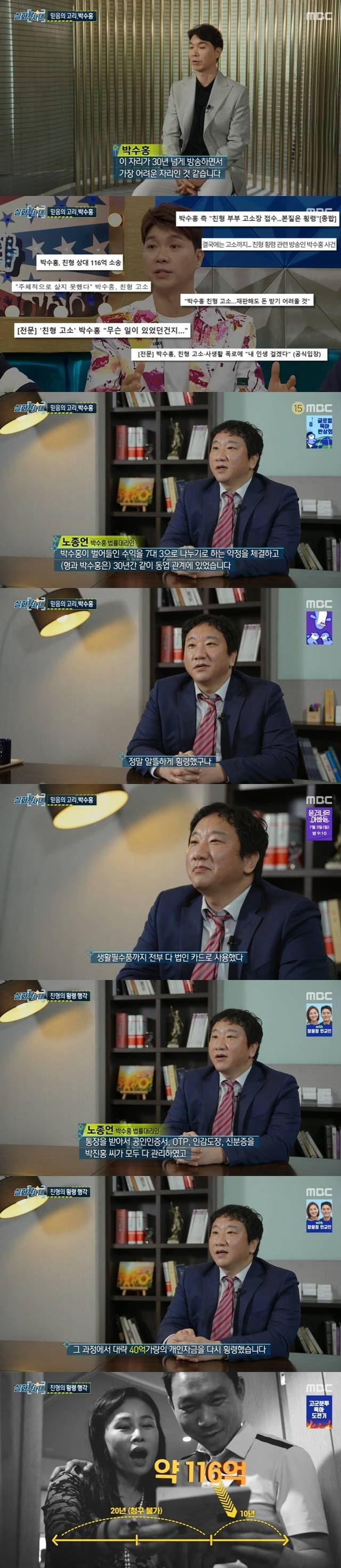 6월 30일 방송된 MBC '실화탐사대'에서는 박수홍 친형 박진홍 씨 횡령 고소 사건을 다뤘다.