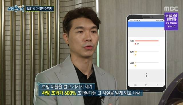 박수홍 명의로 가입된 보험은 8개. 박수홍은 “보험 어플을 깔고 사망 초과가 600% 초과된다는 사실을 알았다. (형이) 저에게는 연금 보험이나 저축성 보험이라고 이야기를 했다. 제가 피보험자인데 그 당시에 미혼이었는데 왜 제가 죽으면 받게 되는 돈을 그렇게 설정했겠냐”고 말했다.