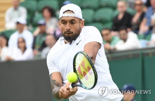 epa10043447 Nick Kyrgios of Australia in action in the men's second round match against Filip Krajinovic of Serbia at the Wimbledon Championships, in Wimbledon, Britain, 30 June 2022. EPA/ANDY RAIN EDITORIAL USE ONLY