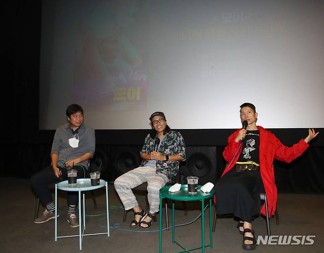 [서울=뉴시스] 조수정 기자 = 다큐멘터리 영화 '모어' KDN 한국다큐멘터리네트워크 특별시사회가 열린 30일 오후 서울 동작구 아트나인에서 이일하(가운데) 감독, 출연자 모지민(오른쪽)씨가 무대 인사 하고 있다. 왼쪽은 모더레이터 이정준 감독. 2022.06.30. chocrystal@newsis.com