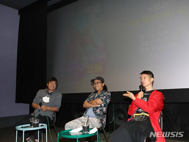 [서울=뉴시스] 조수정 기자 = 다큐멘터리 영화 '모어' KDN 한국다큐멘터리네트워크 특별시사회가 열린 30일 오후 서울 동작구 아트나인에서 이일하(가운데) 감독, 출연자 모지민(오른쪽)씨가 무대 인사 하고 있다. 왼쪽은 모더레이터 이정준 감독. 2022.06.30. chocrystal@newsis.com