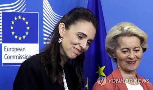 epa10043575 European Commission President Ursula von der Leyen (R) and New Zealand's Prime Minister Jacinda Ardern attend the signature ceremony of a bilateral agreement on security in Brussels, Belgium, 30 June 2022. EPA/OLIVIER HOSLET