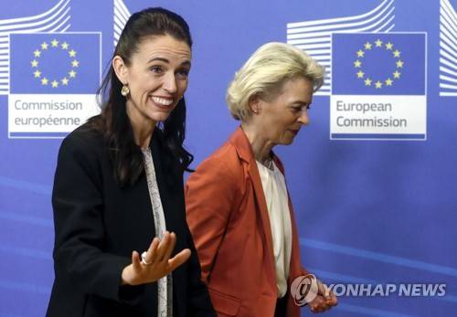 epa10043573 European Commission President Ursula von der Leyen (R) and New Zealand's Prime Minister Jacinda Ardern attend the signature ceremony of a bilateral agreement on security in Brussels, Belgium, 30 June 2022. EPA/OLIVIER HOSLET