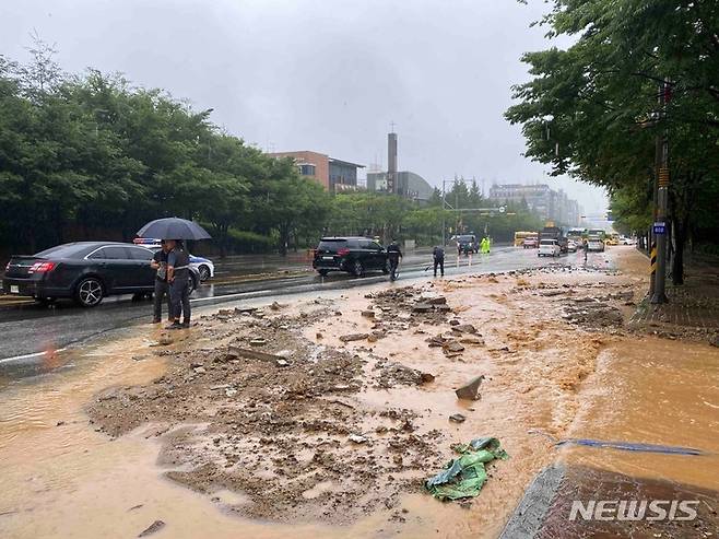 집중호우로 공사장 토사 흘러넘친 인천 도로